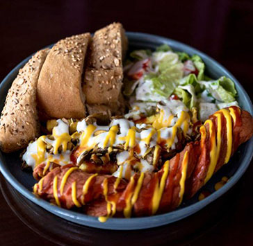 گوشت رست شده، قارچ، پنیر پیتزا، سیب زمینی سرخ شده، سالاد فصل، سس ویژه فرنو, نان روگن مخصوص فرنو